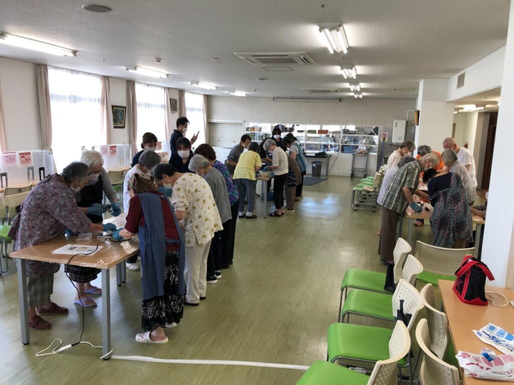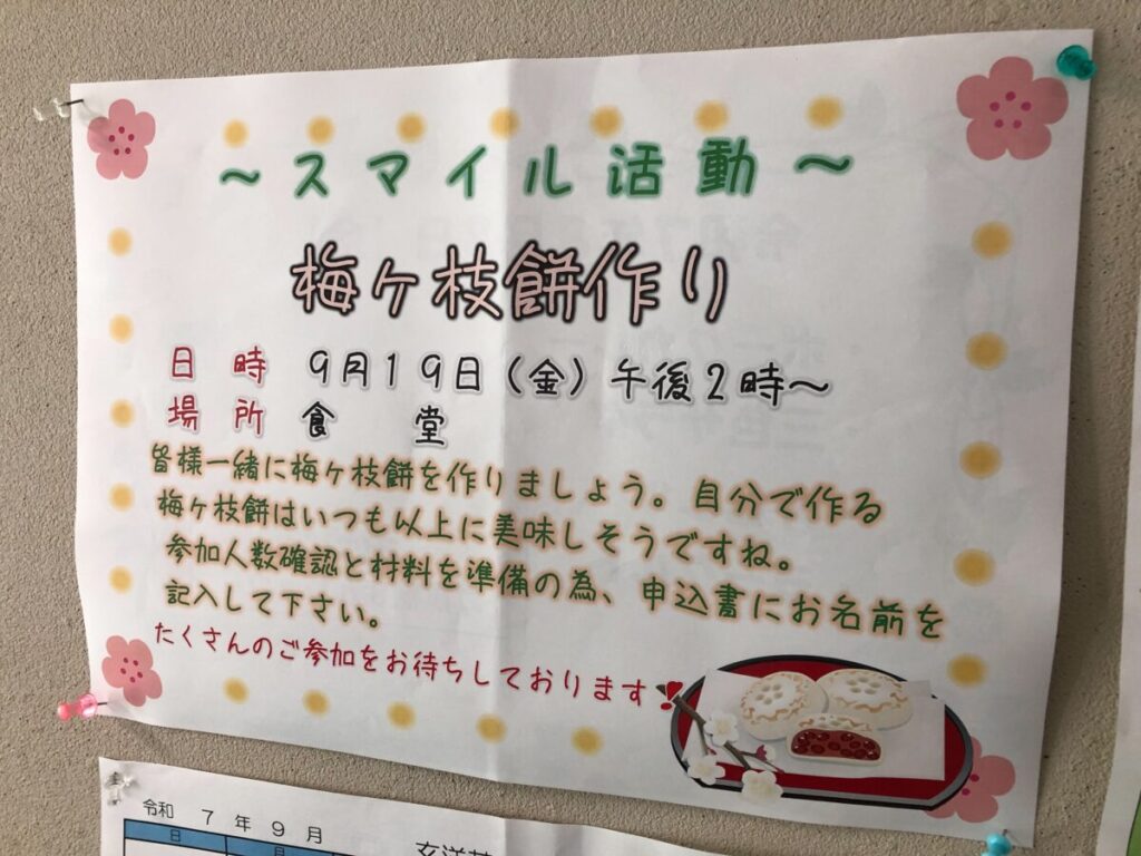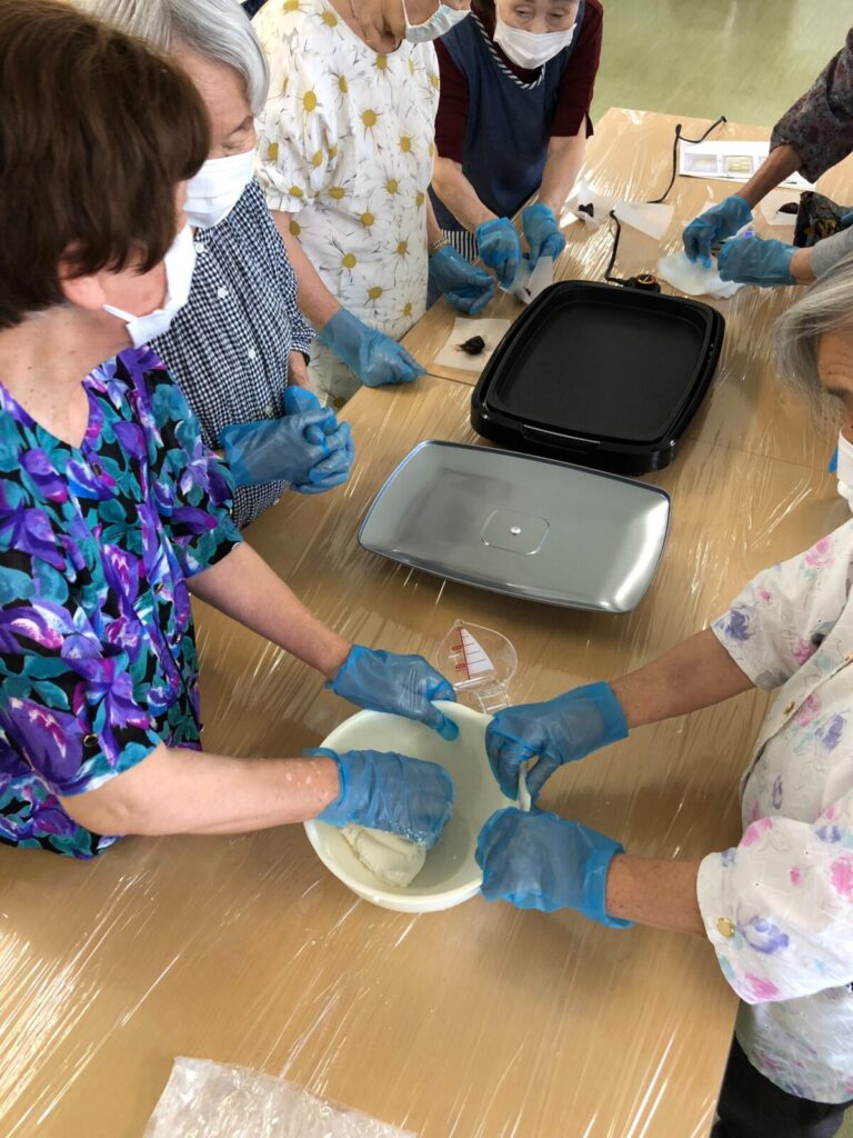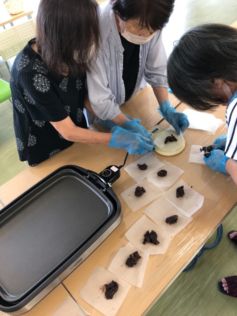 今月のスマイル活動は、梅ヶ枝餅作り。しっかり手洗いとエプロンを着用頂き、多くの方々にご参加頂きました。なんと、和菓子屋さんに昔勤めていらっしゃる方もいて、お餅をこねる所作はまさにプロ。和気あいあいと調理をして頂き、出来立てをほおばって頂きました。