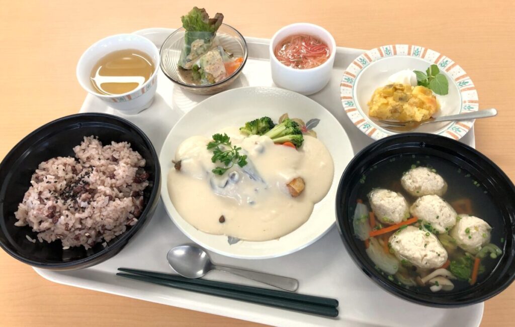 今月も皆さまお待ちかねの、誕生会を開催しました。気になるメニューは、鮭ときのこのクリーム煮・鶏団子汁・生春巻き・カニカマあんの茶碗蒸し・お赤飯・さつま芋ケーキ。秋を感じられる献立てに、皆さま大変ご満足して頂けました。