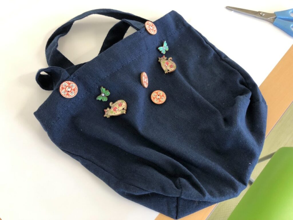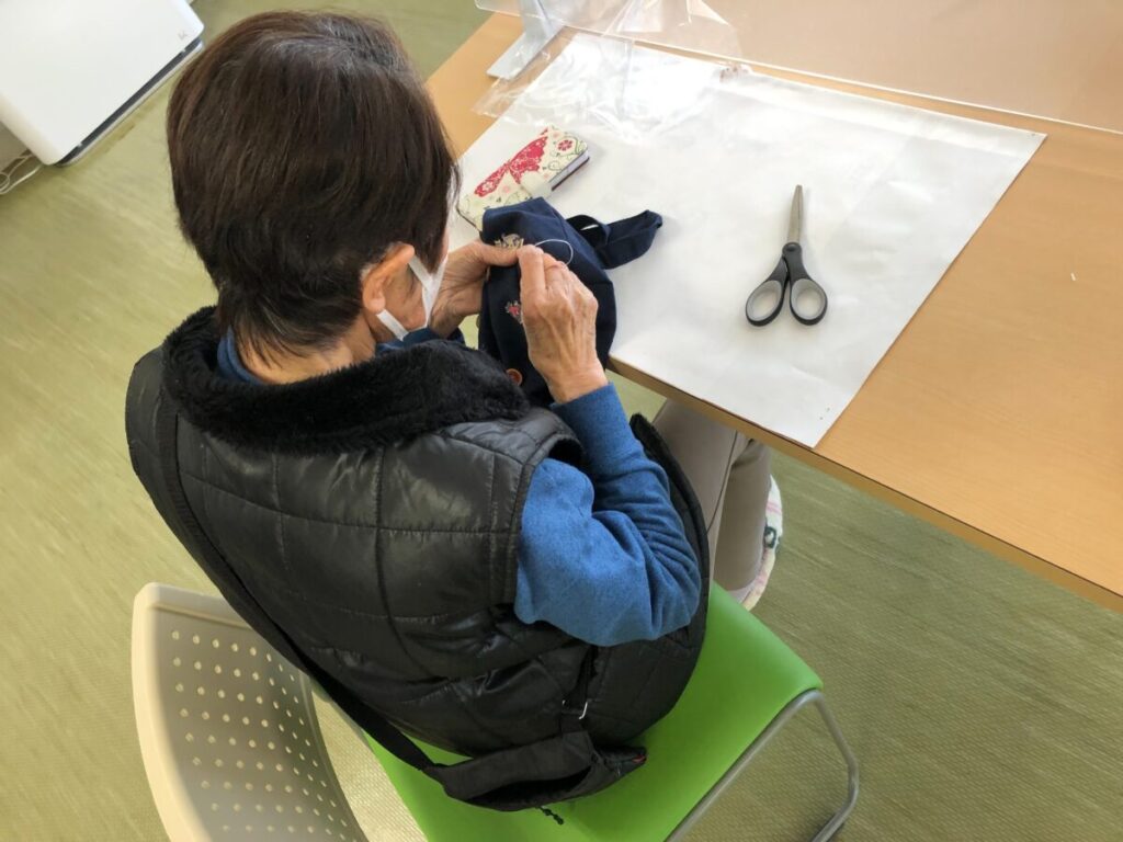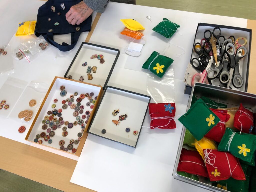 1月のスマイル活動は、オリジナルミニバック作り。色とりどりのボタンを選び、縫い付けて頂く工作イベント。ワンポイントのアクセントとして飾る方、豪快にたくさんつける方、お一人お一人個性的なマイバッグを完成してくださいました。