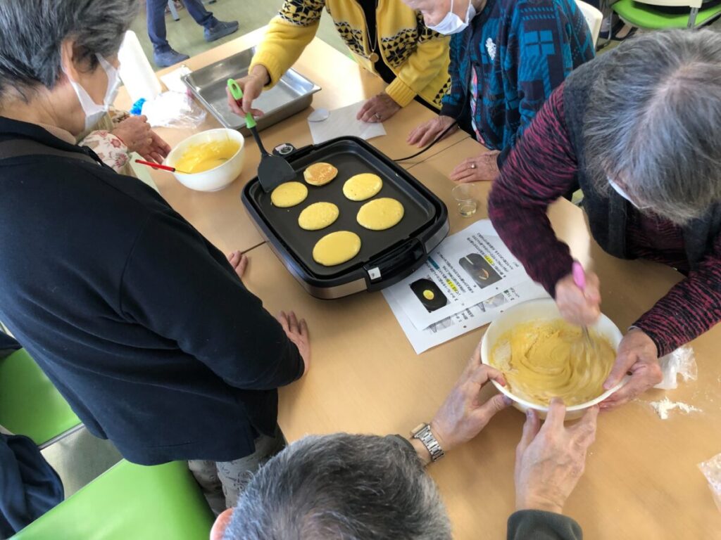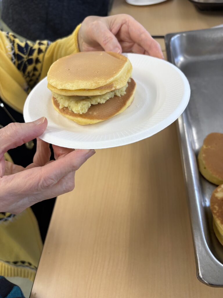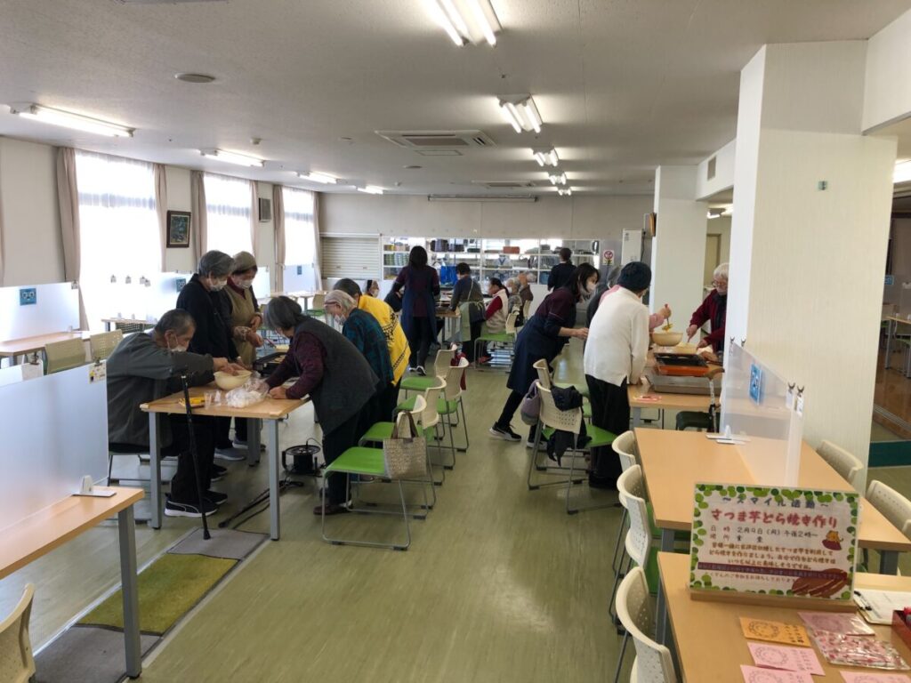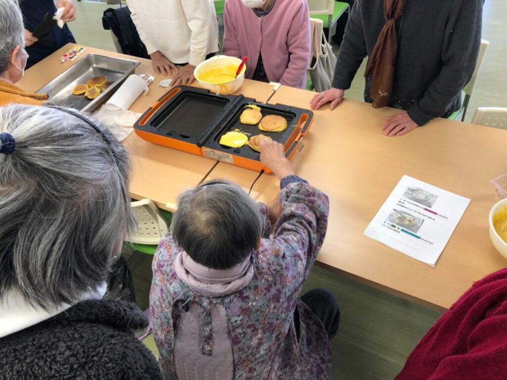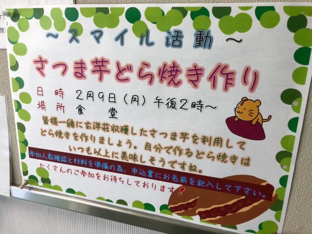 2月のスマイル活動は、どら焼き作り。玄洋荘の中庭で収穫したサツマイモ、実は倉庫で熟成させていました。出来上がったどら焼きは、ホカホカ、フワフワ。手作りだからこその仕上がりに、皆さんも満面の笑顔。楽しく美味しい、昼下がりになりました。